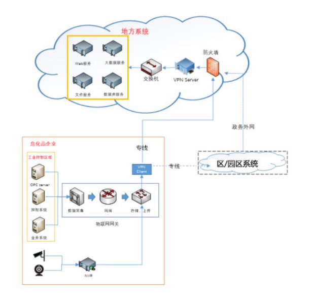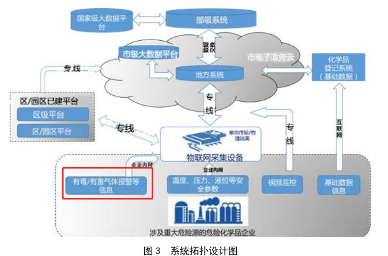 根據應急管理部相關建設指南要求,危險化學品安全生產風險監測預警系統利用數據采集設備,依托專線接入企業重大危險源的實時監測數據和視頻監控數據等,總體架構設計包括應急管理部、市(區)應急管理部門、化工園區(以下簡稱園區)、企業四級,系統建成后分別集成至上海市應急管理綜應用平臺和部級應急管理大數據應用平臺。危險化學品安全生產風險監測預警系統總體架構如圖 1 所示。